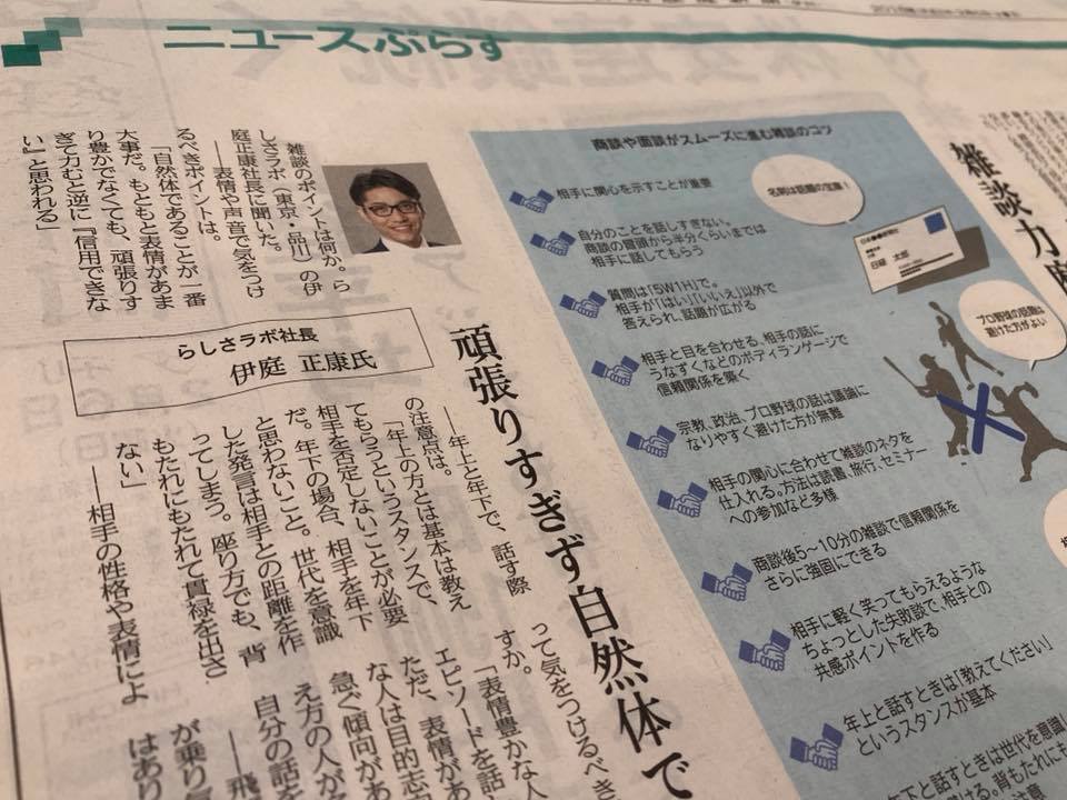 「1分で打ち解ける! 戦略的な雑談術 (明日香出版社)」を書かせて頂いたことから、日本経済新聞さんから取材を頂きました。