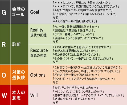 このGROWモデルとは、コーチングのメソッドの1つであり、各ステップの頭文字をとったものですで、専門知識を必要とせずに始められるので、誰もが使える実用性の高いメソッドです。以下の流れで会話を進めます。