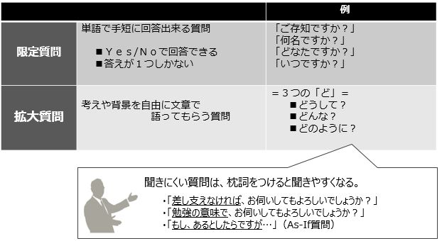 もう1つが、積極的に使って頂きたい「拡大質問」(オープン・クエスチョン)。相手の意見や考えを文章で語ってもらう質問です。「どうして景気が良いと思うのですか?」「忙しそうだね、どんなことがおこっているの?」「どのようにしようと思っているのですか?」などが拡大質問。